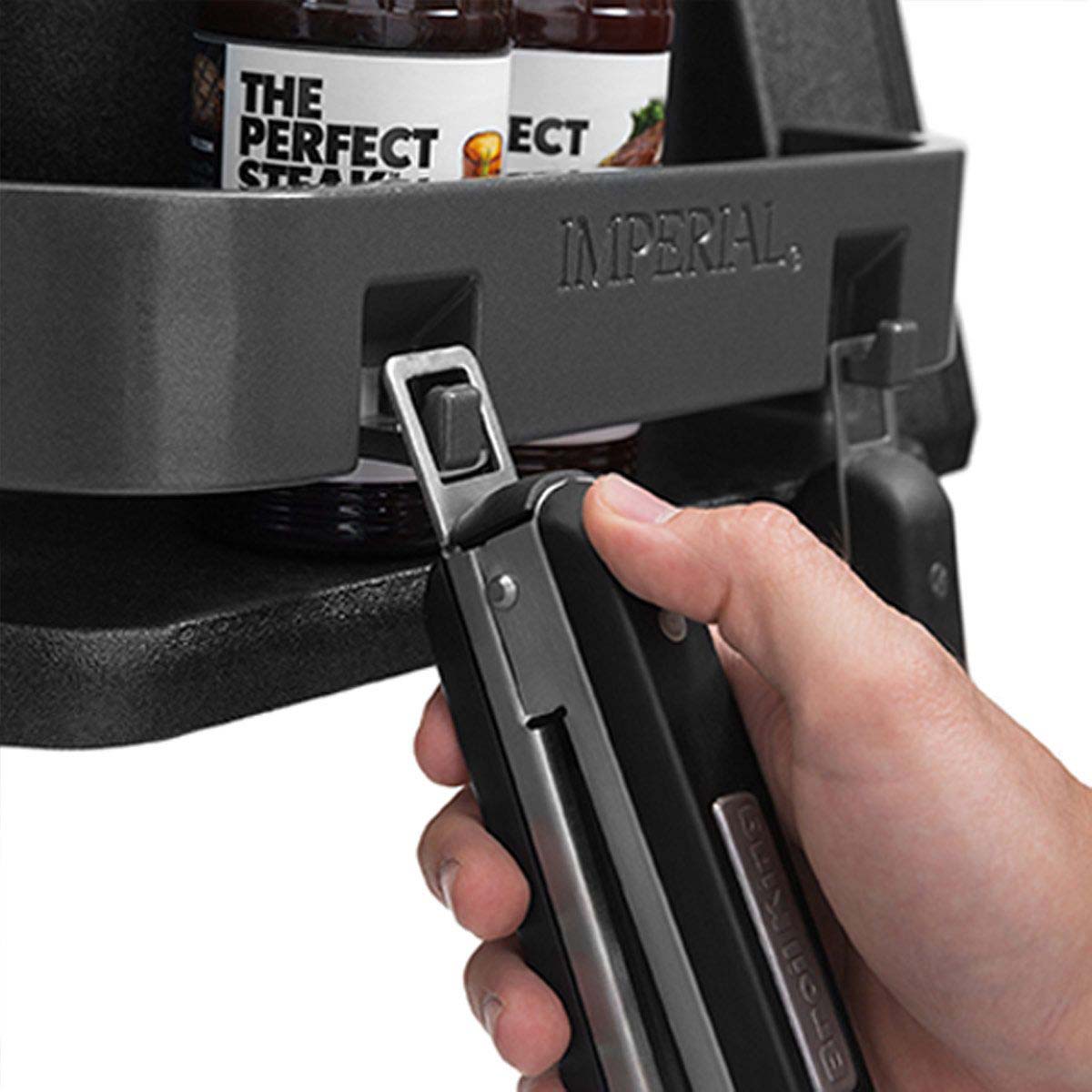 Der Imperial S 590 IR ist ein sehr leistungsstarker Gasgrill mit 5 parallel angeordneten Dual-Tube Gasbrennern welche eine von vorne bis hinten ausgeglichene Gasflamme ermöglichen. Standardmässig ist der Grill mit 5-teiligen Grillrosten aus Edelstahlguss ausgestattet, welche zweiseitig verwendet werden können. Diese höchstmögliche Materialqualität bietet den Vorteil von Masse und Robustheit in einem. Der Garraum ist mit zwei Leuchten ausgestattet die den Grillrost beleuchten. Im linken Seitentisch ist ein Infrarot-Brenner (Sizzle-Zone) eingebaut, welche zum scharfen Anbraten von Steaks etc. verwendet werden kann. Der Imperial S 590 IR ist zudem mit einem rückseitigen Gasbrenner (Rückenbrenner) ausgerüstet. Diese Funktion eignet sich besonderst für das Grillieren mit dem Drehspiess oder auch zur Erzeugung von Oberhitze bei geschlossenem Deckel. Die Reglerknöpfe sind mit blauen LED's innwendig beleuchtet. Die Stromversorgung erfolgt durch einen 220Vac-Transformator. Im Unterschrank mit zwei Türen kann die Gasflasche (Kunststoff 7,5kg / 10kg oder Stahlflasche 10,5kg) verstaut werden. Der Grill-Deckel ist Doppelwandig und isoliert somit sehr gut. Im Unterschrank sind zwei nützliche Schubladen zum Verstauen von Grillzubehör eingebaut.