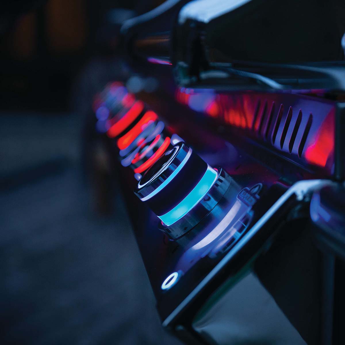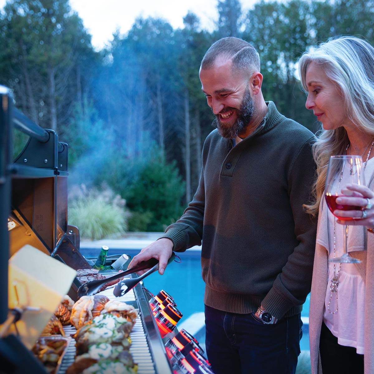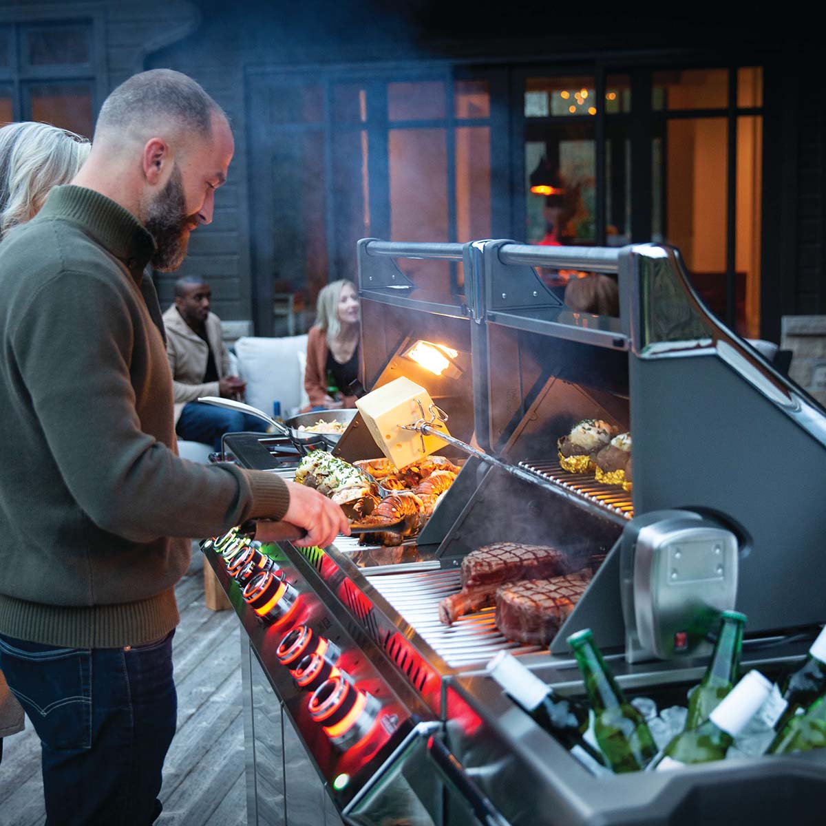 Der Napoleon Prestige PRO™ 825 mit Power-Seitenbrenner und Infrarot-Heck- und Bodenbrennern beweist: Zwei Grillhauben sind besser als eine. Die glänzende Edelstahlkonstruktion sorgt für Langlebigkeit und trotzt den Elementen, während Chrom-Akzente eine Anmutung von Luxus vermitteln. Unsere blauen NIGHT LIGHT™ Bedienelemente mit SafetyGlow Funktion leuchten rot, wenn die Gaszufuhr eingeschaltet ist. Sehen Sie immer, welche Brenner angezündet sind und erzielen Sie so perfekte Ergebnisse beim Anbraten bzw. erkennen Sie die idealen Punkte für das indirekte Garen. Sie erkennen unsere ikonischen Napoleon WAVE™ Grillroste an den charakteristischen Grillstreifen. Die propangasbefeuerte Hauptgrillfläche ist groß genug für ganze Menschen- und entsprechende Grillmengen; außerdem lässt sich der Grill mit der integrierten Räucherpfeife und einem speziellen Brenner in einen Smoker verwandeln. Unter der zweiten Grillhaube befinden sich zwei Keramik-Infrarotbrenner, die innerhalb von Sekunden eine starke Hitze entwickeln – ideal für das scharfe Anbraten von Steaks in Restaurantqualität. Der Prestige PRO™ 825 verfügt über einen zweistufigen Power-Seitenbrenner mit einem Wenderost – ideal für Saucen, Sautés oder Beilagen.