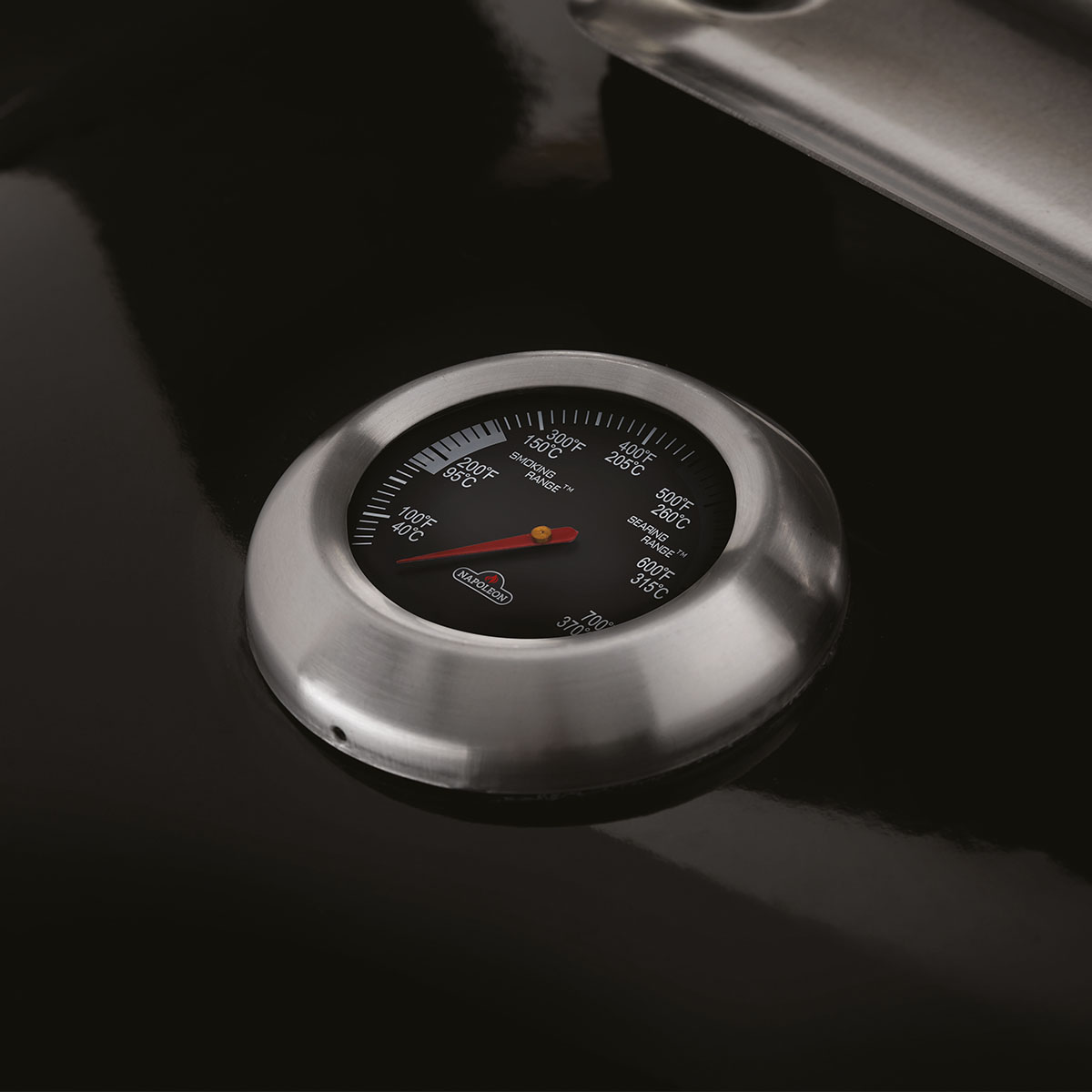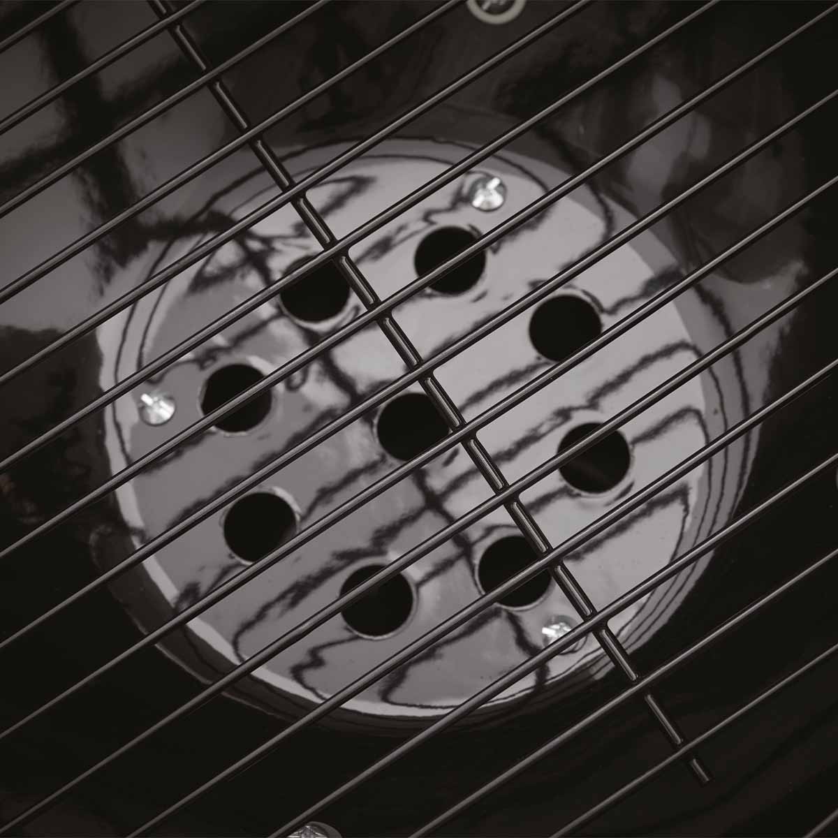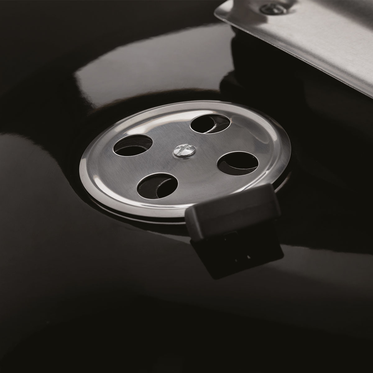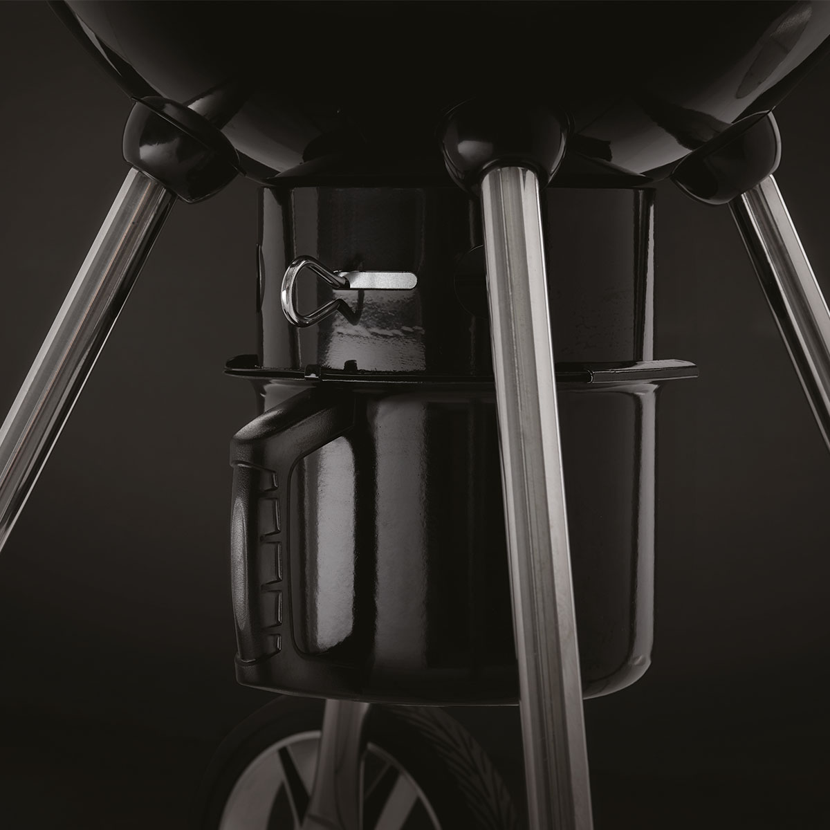 Grillfläche: Ø 47 cm Maße: 52 x 56 x 92 cm | 11 kg Grillrost aus Edelstahl Abnehmbarer, großer Aschebehälter mit Lüftungssystem 4 geschraubte Beine aus Edelstahl, 2 wetterbeständige Räder Deckelaufhängung im Deckel integriert Integriertes Deckelthermometer