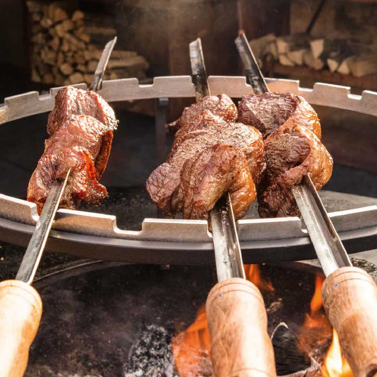 Auf diesem Grillring könnt Ihr Schaschlik und andere Spießgerichte auf der OFYR Feuerschale direkt über dem Feuer grillen – für reichlich Röstaromen und typisch rauchigen Flavour. Der massive Stahlring hat einen Durchmesser von 49 Zentimeter und ist kompatibel mit OFYR Grillhalterungen in der 100er Größe: Wenn Ihr bereits im Besitz eines OFYR Grillrosts 100 oder Brasilianischen Grillsets 100 seid, tauscht Ihr die Einsätze im Grillgestell einfach aus. In Kombination mit Spießen könnt Ihr Fleisch und Gemüse direkt über dem Feuer platzieren und brandheiß und blitzschnell auf den Punkt garen, Eure Zutaten erhalten beim Rösten über der offenen Flamme zusätzlich ein köstliches Raucharoma. Dank der Einkerbungen liegen die Spieße exakt an ihrem Platz, ohne sich zu drehen oder wegzurollen. Passende Grillspieße von OFYR sind im Shop erhältlich. Die OFYR Spieße in V-Form sind sehr stabil und eignen sich perfekt auch für große Fleisch- und Gemüsestücke Hinweis: Der Horizontale Spieße Ring ist auch Bestandteil der praktischen Sets OFYR Horizontale Spieße Set 100 und OFYR 100 Grill Accessoires Set.