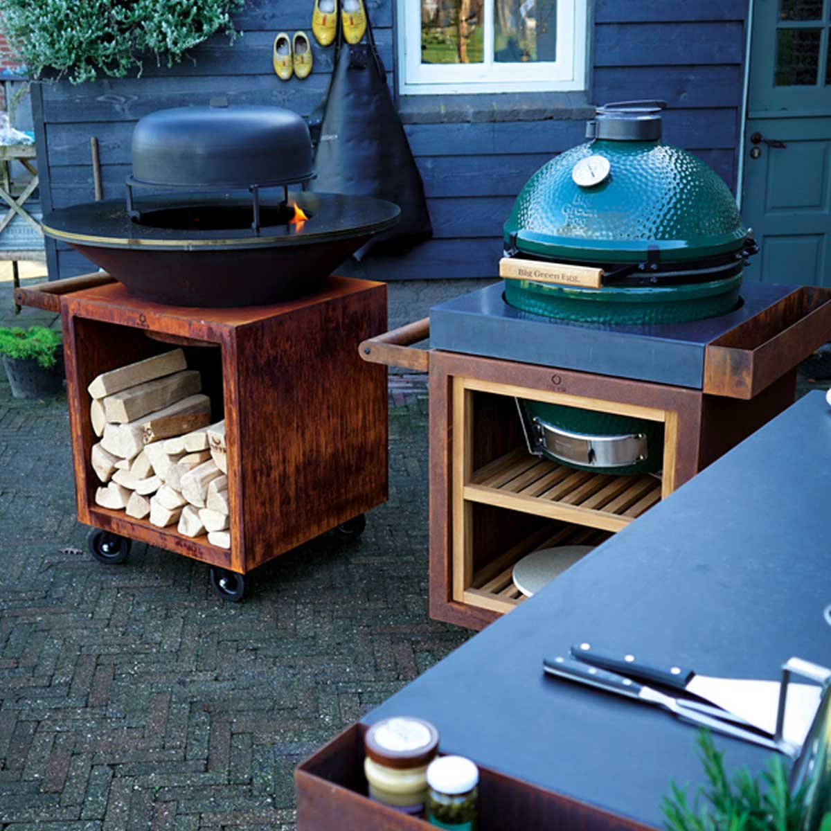 Feuerschale und Kamado gehen in der Outdoor-Küche eine perfekte Verbindung ein: Am Holzfeuer geröstete Zutaten von der Feuerplatte und aromatisch zubereitete Speisen aus dem Keramikgrill bescheren Euch kulinarische Erlebnisse in Vollendung. Die OFYR Kamado PRO Tische sind perfekt geeignet, um Euren Kamadogrill in die OFYR Grillküche zu integrieren. So könnt Ihr komfortabel und in angenehmer Höhe den Kamado nutzen und erhaltet gleichzeitig ein optisch einheitliches Ambiente. Die Kamado Table PRO Module lassen sich problemlos bewegen, denn sie verfügen über vier große Räder (davon zwei Lenkrollen) und einen stabilen Teakholz-Griff. So seid Ihr noch flexibler und könnt den Keramikgrill ganz bequem versetzen. Der offene Sockel unterhalb des Kamado dient als Stauraum z. B. für Holzscheite, so dass Brennmaterial für die Feuerschale immer griffbereit und trocken gelagert werden kann. Im praktischen Ablagefach neben der Arbeitsfläche finden Kräuter, Gewürze, Öle oder Grillzubehör einen griffbereiten Platz.OFYR Kamado Table Corten 65 PRO Concrete für Big Green Egg Large