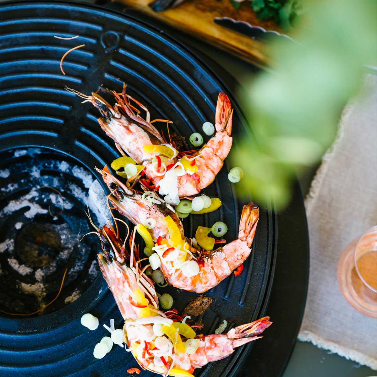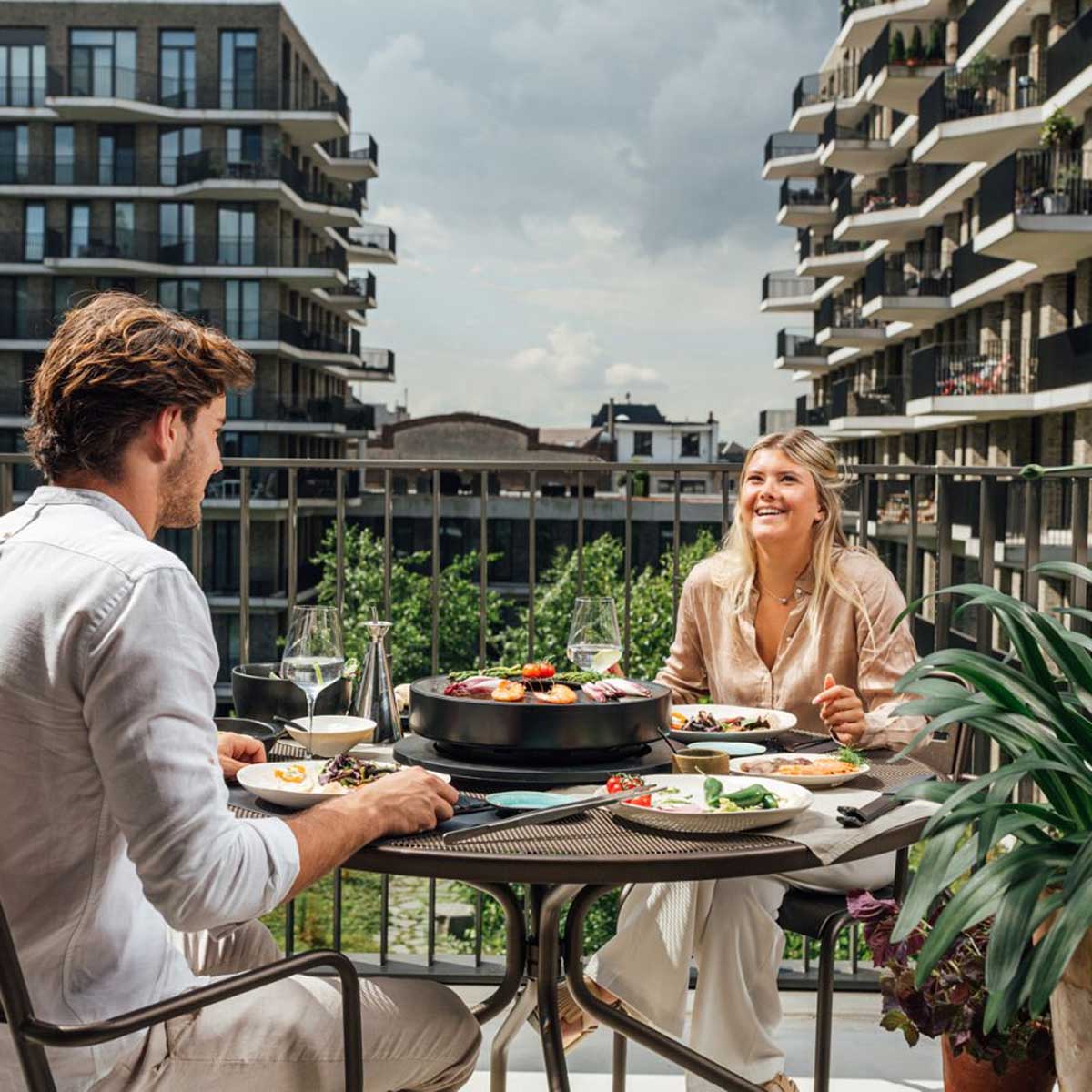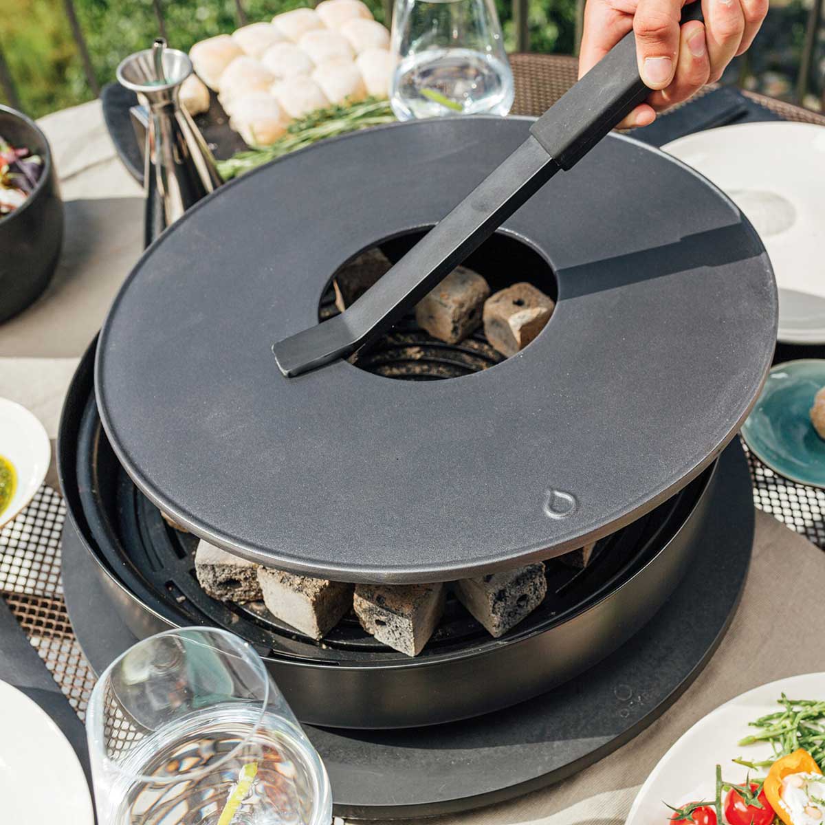 Die Handhabung des Tabl'O ist denkbar einfach. Mithilfe des Anzündkamins sind die Grillbriketts schnell auf Temperatur gebracht, mit der Greifzange verteilt Ihr die glühenden Briketts auf dem Kohlerost. Zudem nutzt Ihr die Zange zum Auflegen, Anheben und Wenden der Grillplatte. Der Sockel aus hitzebeständigem Bakelit sorgt für ausreichenden Schutz der Tischplatte. Nach dem Aufheizen und Einölen der Gussplatte könnt Ihr sofort loslegen mit der gemeinsamen Zubereitung von raffinierten Köstlichkeiten: Von Frühstück mit Ei und Bacon über Steak, Spießen und Meeresfrüchten bis Obst und Desserts sind Euren Grillkreationen keine Grenzen gesetzt.Highlights des OFYR Tabl'O Tischgrills