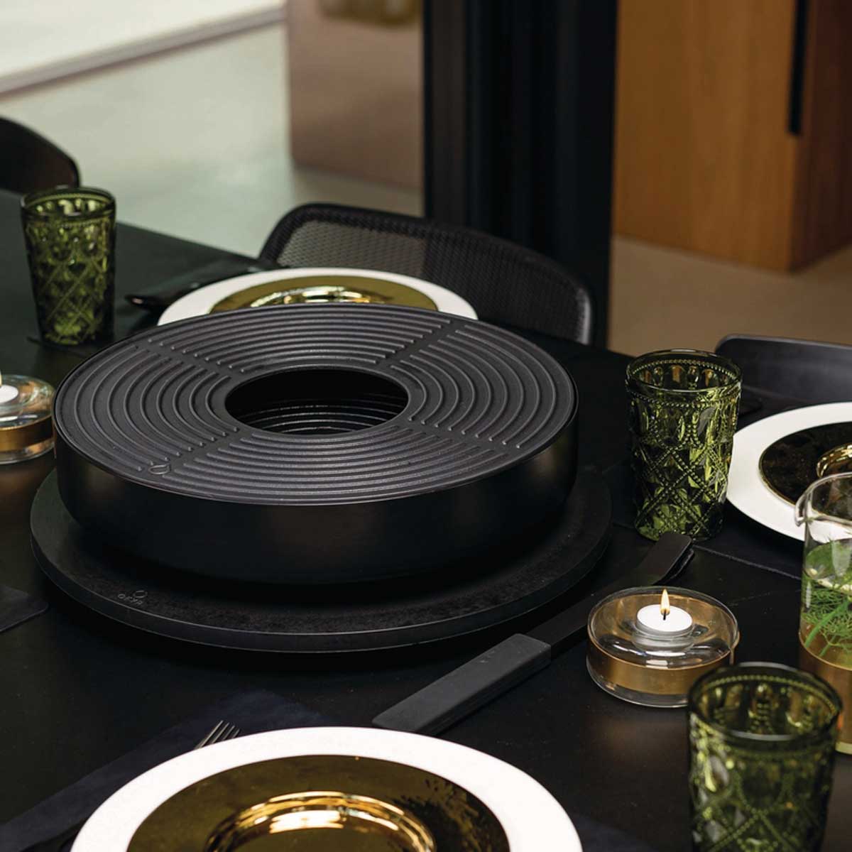 Geselliges Planchagrillen direkt am Tisch Massive Feuerplatte aus Gusseisen (Stärke 1 cm) für ideale Hitzeverteilung Beidseitig verwendbare Grillplatte mit geriffelter und glatter Seite Hitzebeständiger Sockel aus Bakelit zum Schutz der Tischplatte Elegantes Design Großzügige Grillfläche mit einem Durchmesser von 39,5 cm Geeignet für die Zubereitung von Gerichten für 2 - 6 Personen Hält die Temperatur für 2-3 Stunden mit 16-20 Kokosnussbriketts Inklusive Greifer und Anzündkamin Perfekt für Urlaub & unterwegs Tolles Zubehör für viele weitere Zubereitungsarten erhältlich