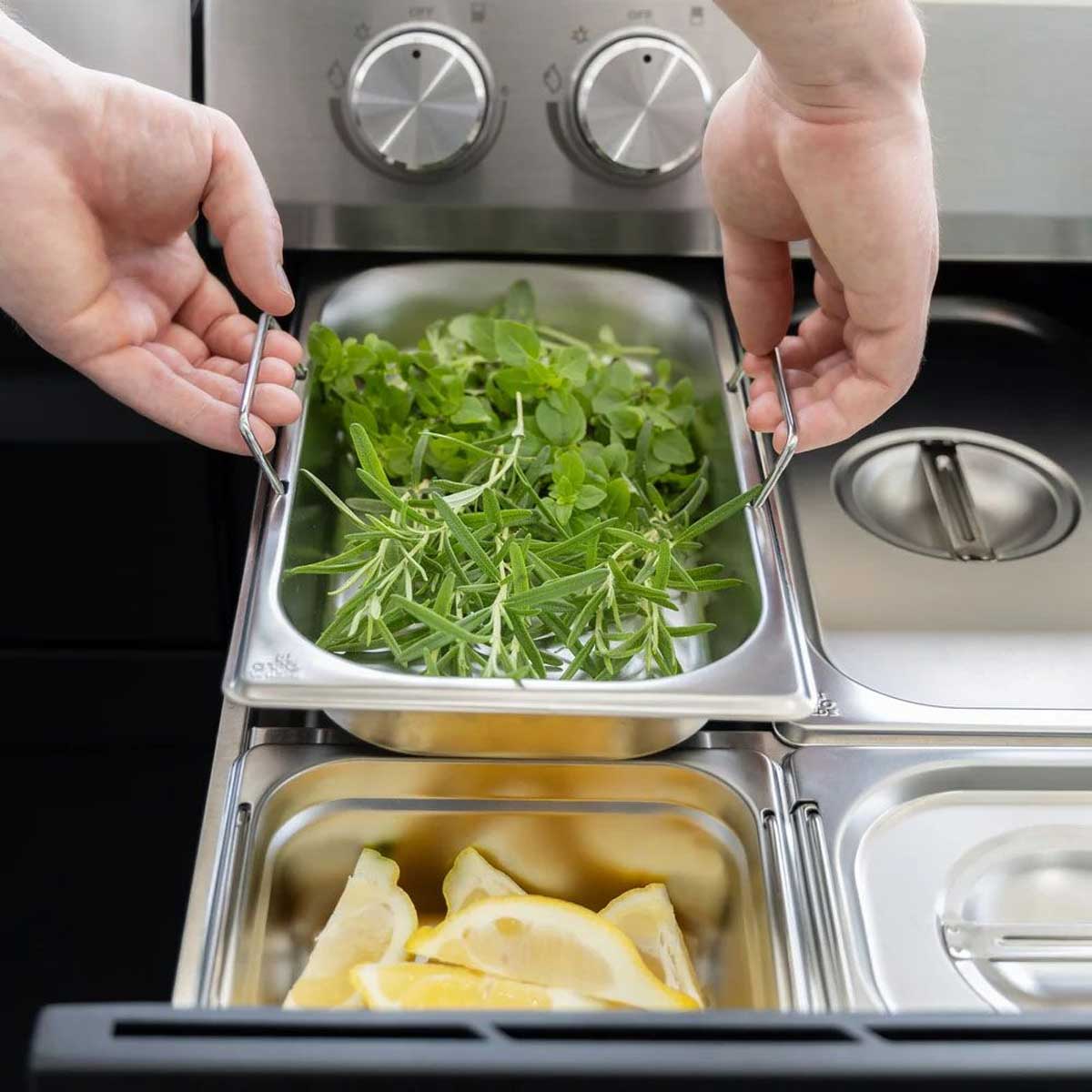 Organisiert den Stauraum Eurer Schubladen ganz individuell und nutzt dabei jeden Zentimeter. In Eurer Plattform Outdoorküche von Otto Wilde herrscht auch in den 16”-Schubladen beste Ordnung – das schont Zeit und Nerven. Mit Schubladen-Einsätzen und Gastro-Normbehältern in verschiedenen Größen passt Ihr den Stauraum Euren Ansprüchen und Bedürfnissen an. Durch die genormten Größen fügen sich die Behälter-Sets mit allen anderen Behältern perfekt in die Schubladen-Sets ein. Zutaten, Gewürze, Besteck, Zubehör – hier findet alles seinen angestammten Platz. Mit den Griffen sind die Behälter zudem leicht in der Handhabung. Ob heißer oder kalter Inhalt: Die Schalen aus Edelstahl sind lebensmittelecht, hygienisch und leicht zu reinigen. Und mit den passenden Deckeln ist alles sicher verstaut, was in deinen Behältern gelagert wird: Egal ob zum Warmhalten oder Schützen.