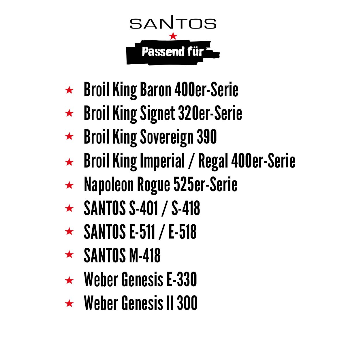 Leichte Grillhaube aus hochwertigem Polyestergewebe mit PU-Beschichtung. Wasserabweisendes, robustes und widerstandsfähiges Material garantiert Schutz und Langlebigkeit. Die Nähte sind wasserdicht versiegelt (ausgenommen Reißverschluss und Entlüftung), damit auch Regenwetter kein Problem darstellt. Das Material ist atmungsaktiv, wasserabweisend und bietet Schutz gegen Ausbleichen. Die Schutzhülle ist durch ihr geringeres Gewicht besonders bei häufigem Wechsel empfehlenswert. Während Euer Grill in Benutzung ist, könnt Ihr die Schutzhülle in der praktischen Aufbewahrungstasche verstauen. Die passende Schutzhülle für Euren Grill – bei SANTOS für viele Marken und Modelle erhältlich! Broil King Baron 400er-Serie Broil King Signet 320er-Serie Broil King Sovereign 390 Broil King Imperial / Regal 400er-Serie Napoleon LE 1 / 2 / 3 / 485 Napoleon Lex 485 Napoleon Rogue 525er-Serie SANTOS Denver / Memphis SANTOS S 401 / S 418 SANTOS E 511 / E 518 SANTOS M 418 Weber Genesis E-330 Weber Genesis II 300 Vor Benutzung der Grillabdeckung den Grill abkühlen lassen. Vorsicht bei scharfen Kanten am Grill, da sonst die Haube in diesem Bereich beschädigt werden kann. Hier sind Kantenschoner hilfreich. Bei länger andauerndem Gebrauch der Schutzhülle, z.B. in den Wintermonaten, bitte zur Vermeidung von Schimmel und Staunässe die Abdeckhaube gelegentlich abnehmen und lüften. Zur Reinigung mit klarem Wasser abwaschen bzw. mit dem Wasserschlauch abspritzen.