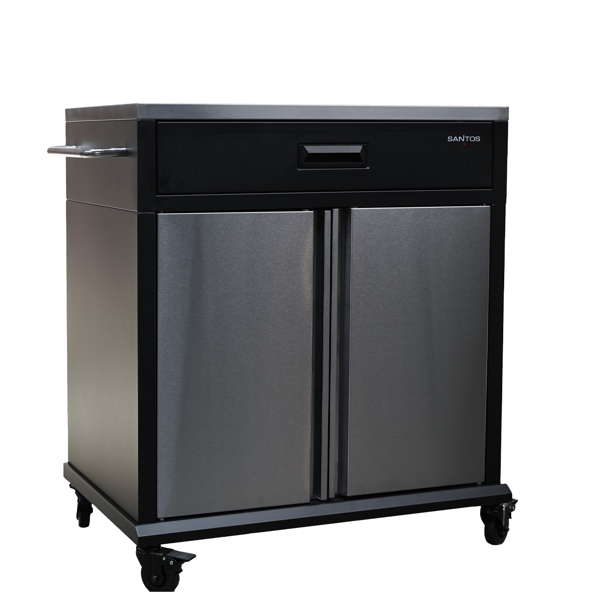 Der mobile Beistellschrank eignet sich hervorragend für ein funktionelles Upgrade rund um Euren bereits vorhandenen Grill. Mehr Arbeitsfläche, mehr Ablage und mehr Stauraum – das sind die entscheidenden Zutaten, um Eure heimische Grillecke aufzuwerten und eine komfortable Außenküche zu zaubern. Das Cabinet aus pulverbeschichtetem Stahl mit Türen aus Edelstahl ist ausgesprochen robust und langlebig und wird Euch ein langes BBQ Leben begleiten. Besonderen Komfort bieten die hochwertigen Lenkrollen. Die großen Gummirollen sind sehr leichtgängig, wendig und geräuscharm. Mit der PVC-Ummantelung sind sie gleichzeitig robust und strapazierfähig und machen Euer Cart auch auf unebenem Gelände mobil. Alle vier Rollen sind mit einer Feststellbremse ausgestattet, so dass Ihr die Position Eures Pro Carts sicher fixieren könnt. Das SANTOS BBQ Cart Pro passt mit den verdeckten Griffleisten optisch perfekt zur SANTOS Pro Gasgrill-Serie und ergänzt Euren Grill im gleichen geradlinigen Look. Kombiniert das Cart Pro in der Edelstahl-Variante mit dem SANTOS S Pro Edelstahl Gasgrill – für eine kompakte Profi-Außenküche im eleganten Design.