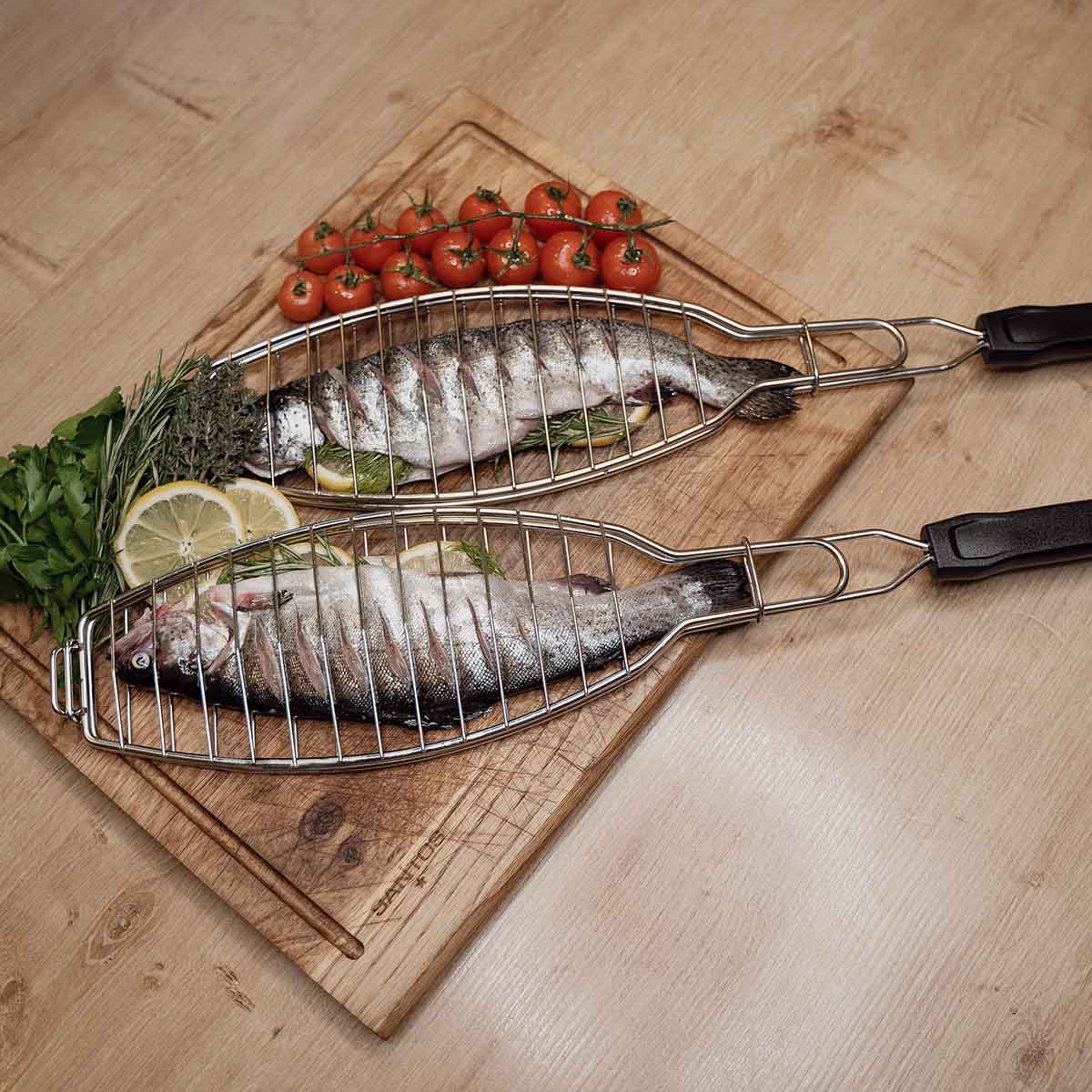 Das Problem kennt wohl jeder Fischliebhaber: Die frische Forelle liegt mit einer herrlich knusprigen Haut auf dem Grillrost, man hantiert zum Drehen mit dem Wender – und prompt bleibt die Haut am Rost haften, der Fisch zerbricht und fällt durch die Streben. Mit dem Fischbräter von SANTOS habt Ihr den passenden Grillkorb, der Euch eine entspannte Zubereitung von rundherum gleichmäßig gegarten ganzen Grillfischen bietet.