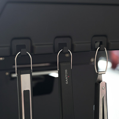 Die schwarzen, pulverbeschichteten Seitenablagen verfügen über Haken, an denen Ihr das Grillzubehör wie z.B. Grillzange oder Grillbürste aufhängen könnt. Zusätzlich ist die rechte Seitenablage durch einfaches Heben nach unten weg klappbar. Damit schafft Ihr schnell Platz und der Grill kann einfacher positioniert oder verstaut werden.