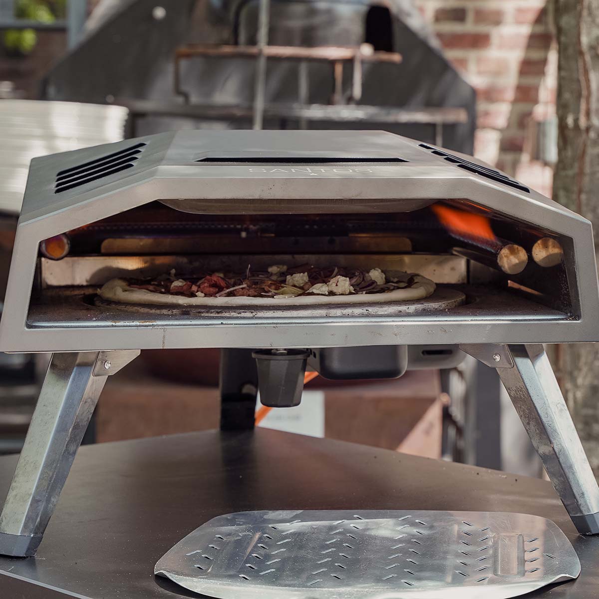 Der neue SANTOS Pizzaofen O-160 B in Schwarz ist die ideale Ergänzung für Eure Außenküche. Mit 8KW Heizleistung erreicht ihr ideale Temperaturen zum Backen von knusprigen Pizzen. Der im Lieferumfang enthaltene Pizzastein mit 37cm Umfang reicht für eine große Pizza, die ihr nach Belieben belegen könnt.
