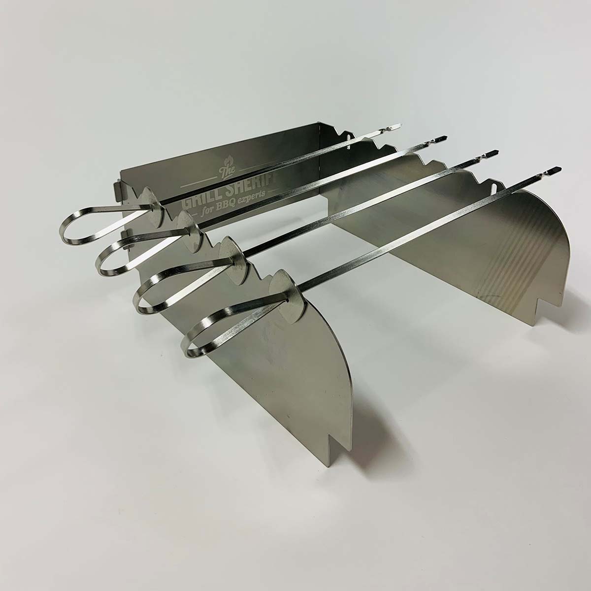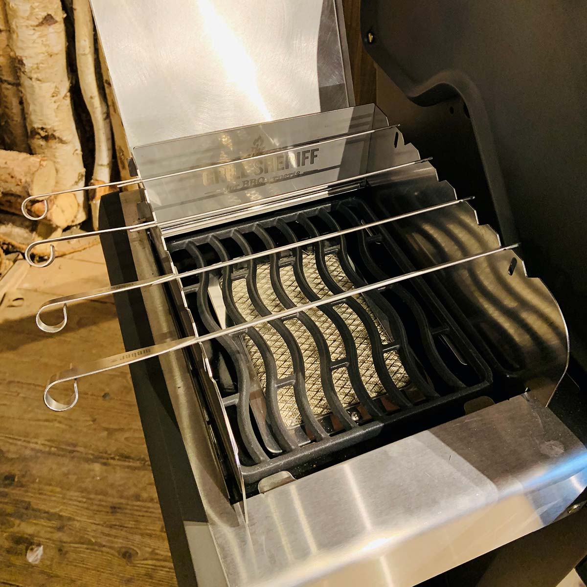 Spiesshalterungs-Funktion: Dank der zackenförmigen Einschnitte in den beiden Seitenteilen ist es möglich, bis zu 8 Spiesse (nicht im Lieferumfang) parallel aufzulegen und über der Infrarot-Hitze direkt zu grillieren. Die Spiesse liegen ca. 8cm über der Sizzle Zone. Die Distanz zwischen den beiden Seitenteilen liegt bei 23,5cm. Die Länge der Spiesse muss deshalb mindestens ca. 27cm oder mehr betragen.